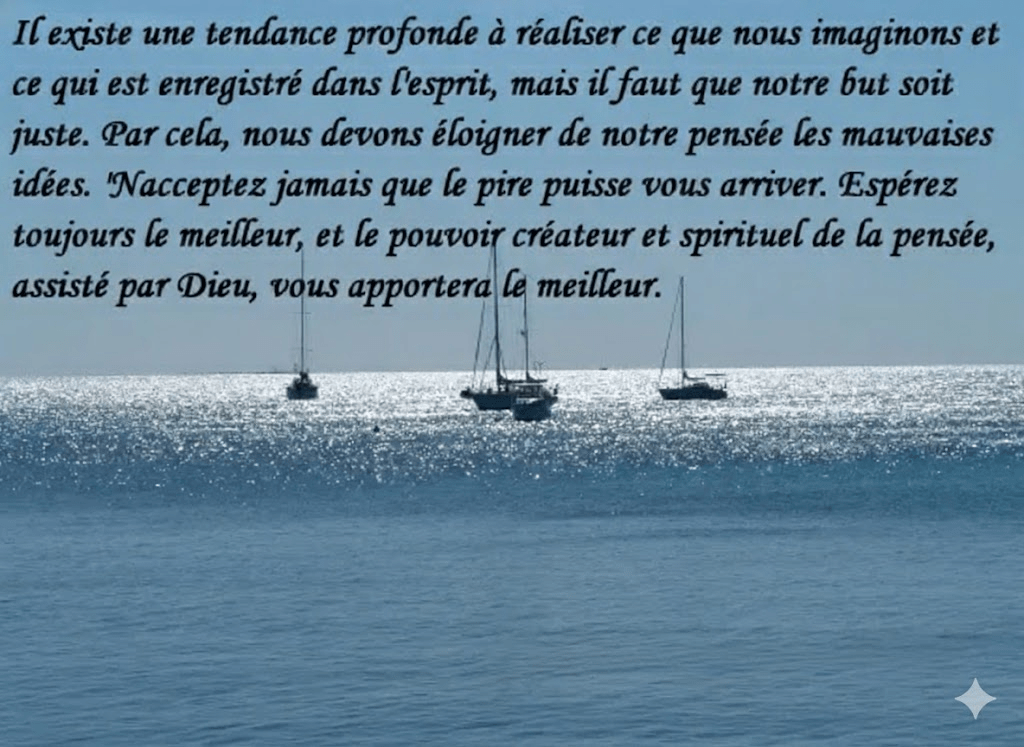 Il existe une tendance profonde à réaliser ce que nous imaginons et qui est enregistré dans l’esprit, mais il faut que notre but soit juste. Pour cela, nous devons éloigner de notre pensée les mauvaises idées. N’acceptez jamais que le pire puisse vous arriver. Espérez toujours le meilleur, et le pouvoir créateur et spirituel de la pensée, assisté par Dieu, vous apportera le meilleur.